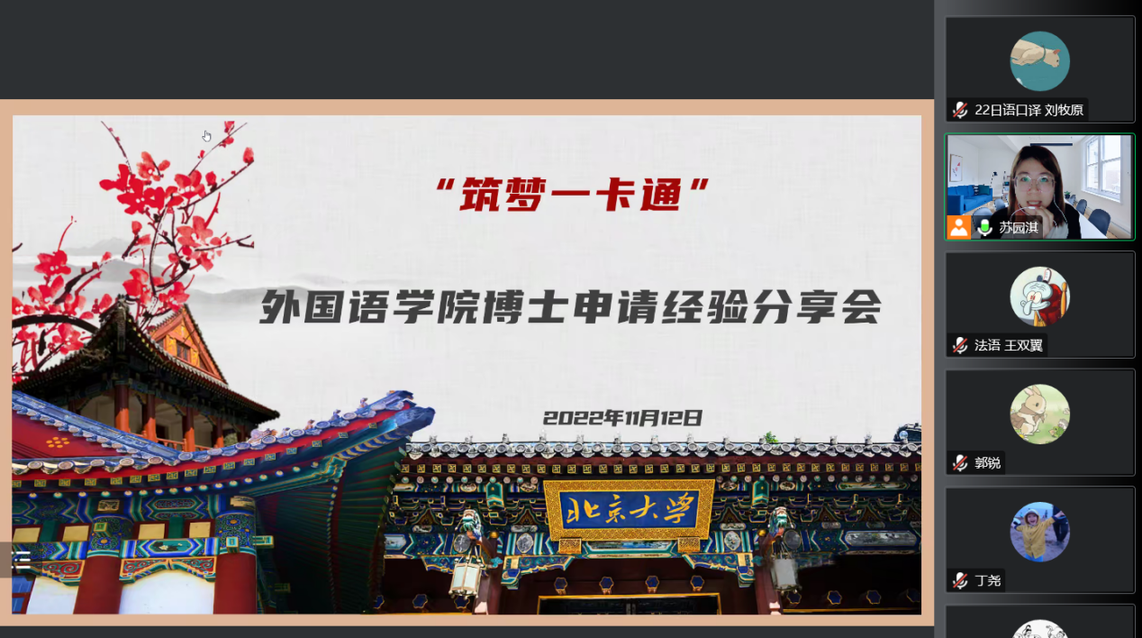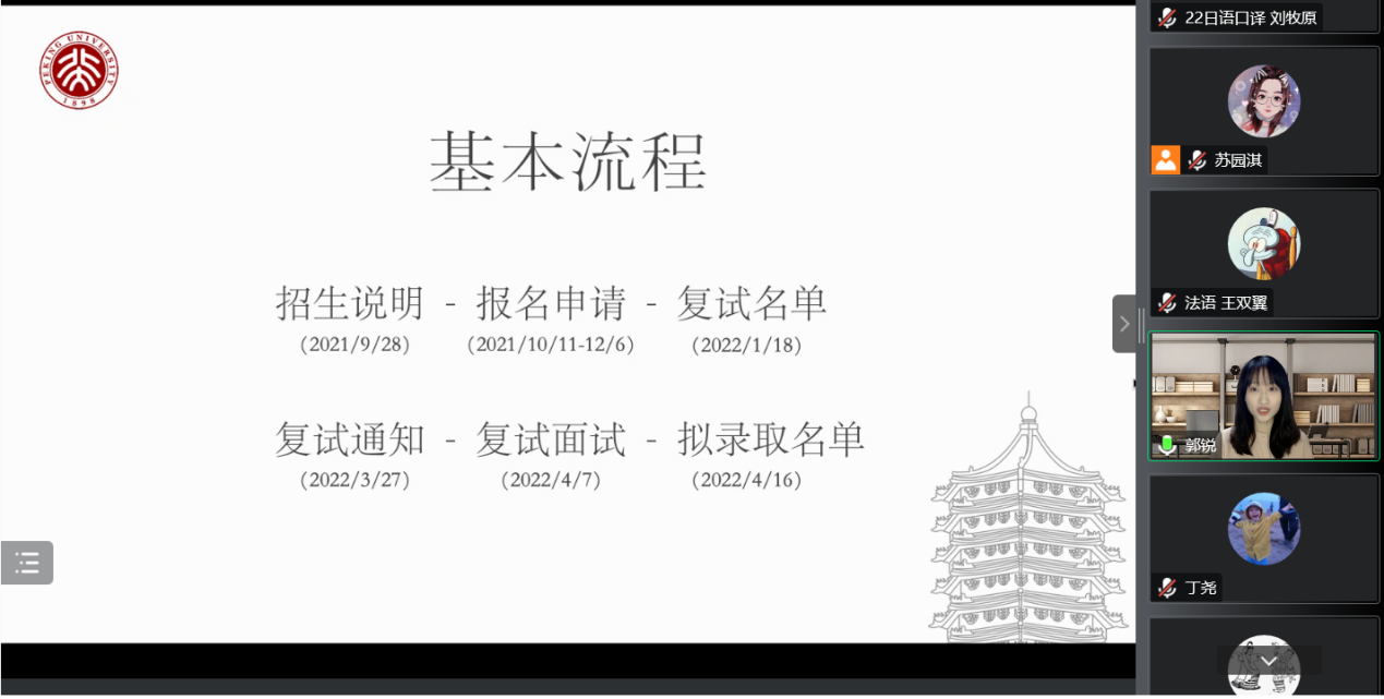 为满足同学们深入了解博士申请流程的实际需求,帮助有志于继续深造的同学们做好相关规划,开云官方在线入口研究生会就业部于11月12日晚以线上形式顺利举办“薪火相传,朋辈引领”博士申请经验分享会,外国语学院党委副书记王恒、团委书记伍昕钰、辅导员丁尧出席活动。