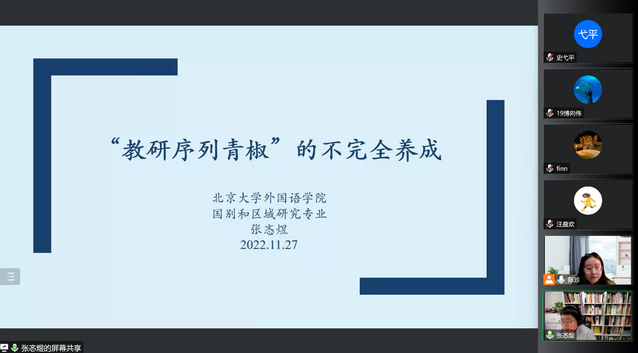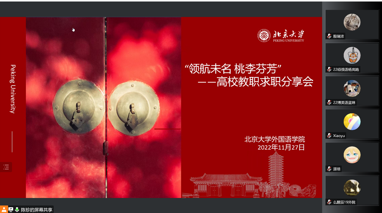 习近平总书记曾明确指出:“教师是教育工作的中坚力量。有高质量的教师,才会有高质量的教育。”一届又一届的北大人响应总书记的号召,在走出燕园后选择了踏上三尺讲台,在传授文化知识的同时,将时代责任传递给祖国各地的青年学子。为了帮助有志于教育事业的同学们进一步明确努力方向,2022年11月27日下午,外国语学院以线上形式举办了“领航未名 桃李芬芳”外国语学院高校教职求职分享会。外国语学院党委副书记王恒、团委书记伍昕钰、辅导员丁尧,以及学院五十余名学生参加了本次分享活动。