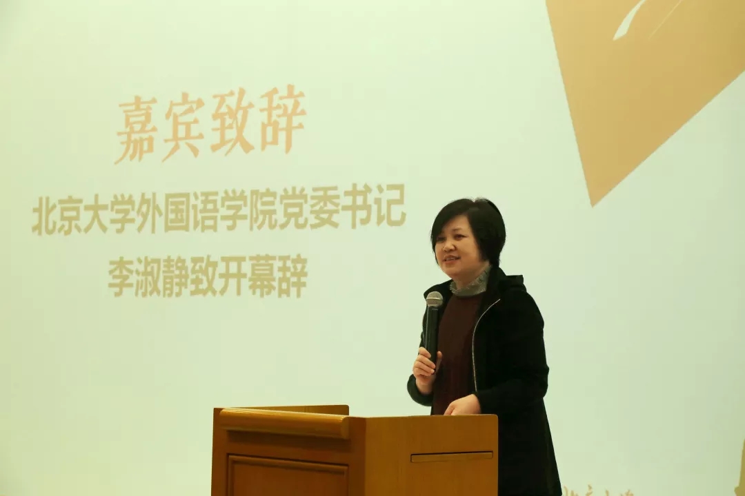 视频播放结束后,李淑静致开幕辞,她对各位师生的到来表示欢迎。李淑静追溯了北大外文百余年发展历程,强调了在风起云涌、互联共融、充满机遇的新时代,外院肩负的特殊的历史使命,一方面,外院凭借语言工具的支撑,得以全方位、深层次地研究和介绍中国以外的世界,让中国更了解世界;另一方面,外院培养合格的世界公民和外语专家,在国际社会发出中国声音、讲述中国故事、贡献中国力量,让世界更了解中国。外国语学院培养的不仅仅是语言人才,更推进文学、语言学、翻译学、历史与文化研究、区域与国别研究的齐头并进,多领域培养对外交流人才,满足新形势下多层次、多维度的开放包容、互学互鉴、民心相通。她还表达了对外院同学作为圆梦新一代,在广阔天地实现价值的殷切期望。她表示,外院的发展始终与祖国同向、与时代同行、与民族的命运同前进。李淑静宣布外院文化节正式开幕。