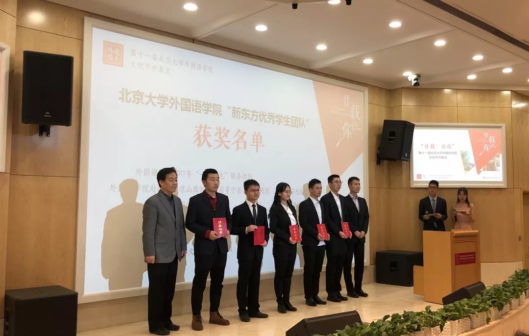 接下来进行的“新东方优秀学生团队”颁奖仪式中,10支获奖团队代表上台领奖,李淑静、高静、付志明、宋扬上台为获奖代表颁奖。之后,“新东方优秀学生团队”获奖团队代表、外国语学院2018级亚非语言文学硕士研究生许洋分享东南亚华文教育调研小组团队实践收获。