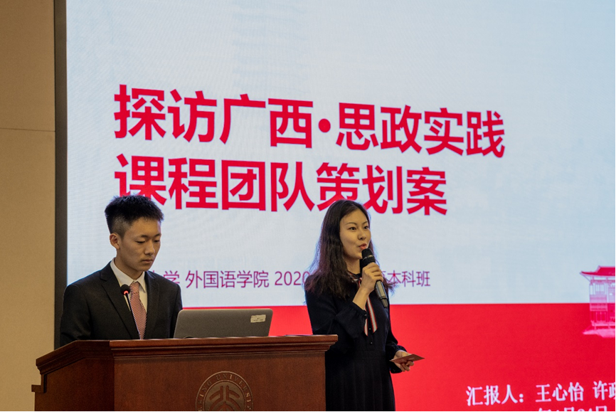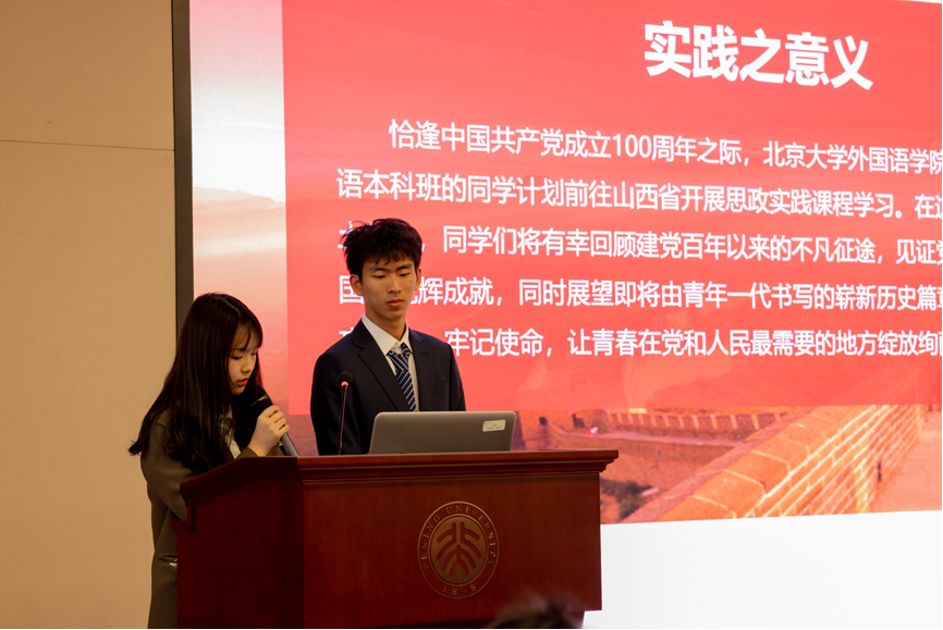 4月24日上午,外国语学院“红色百年,青年有约”思政实践课程活动策划大赛在民主楼208会议室举行。外国语学院党委书记李淑静,北京大学团委副书记、前沿交叉学科研究院党委副书记林思聪,外国语学院党委副书记王恒、宋扬,青年研究中心副主任、外国语学院第二班主任许凝受邀出席。院团委书记卢敏,专职辅导员王乃懋、王志峰,2020级思政实践课程团队汇报人、部分团队成员共同参与活动。大赛由外国语学院2020级开云官方在线入口余心悦、宋博源主持。