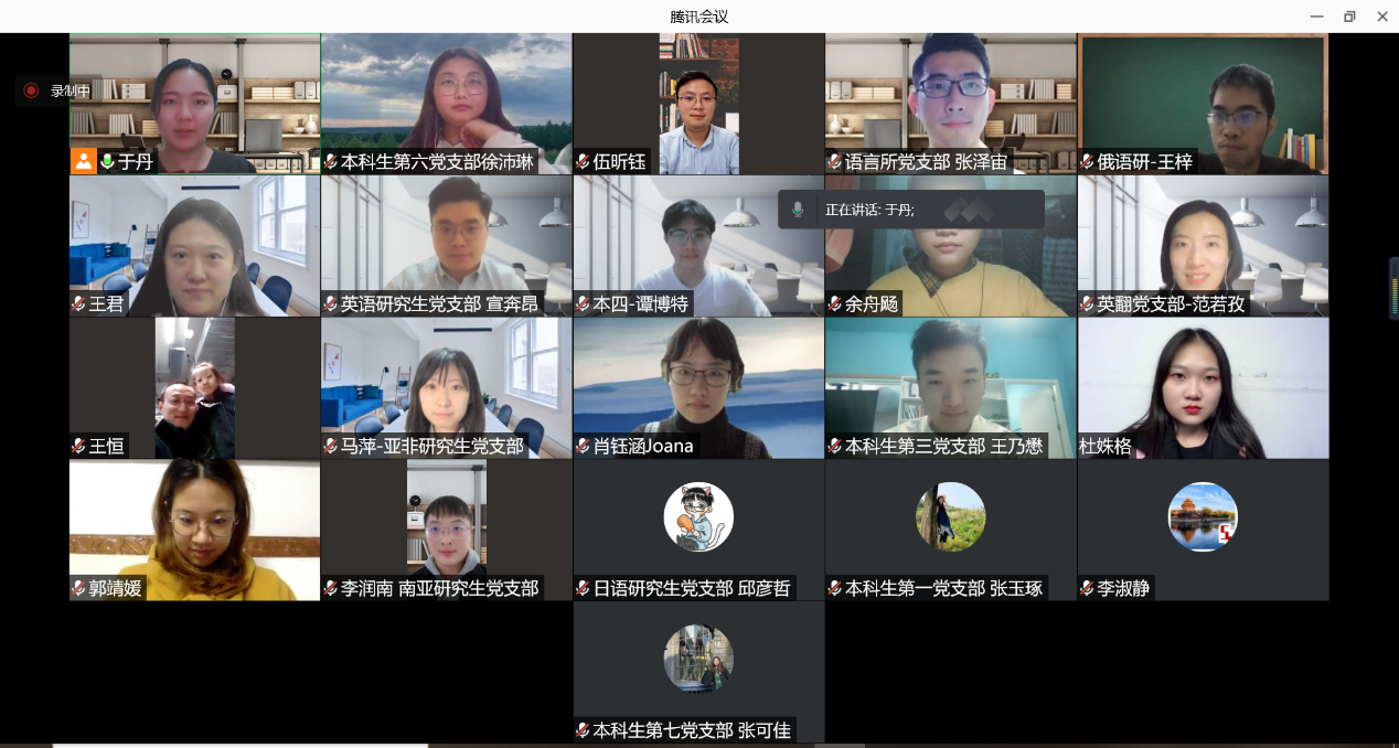为充分发挥党支部基层战斗堡垒作用,激发党员引领示范效应,12月17日晚,外国语学院召开2021年度学生党支部书记工作交流会,本次交流会采用腾讯会议线上开展,会议邀请到党委书记李淑静、党委副书记王恒、团委书记伍昕钰。会议由团委常务副书记于丹主持,18名学生党支部书记参加会议。