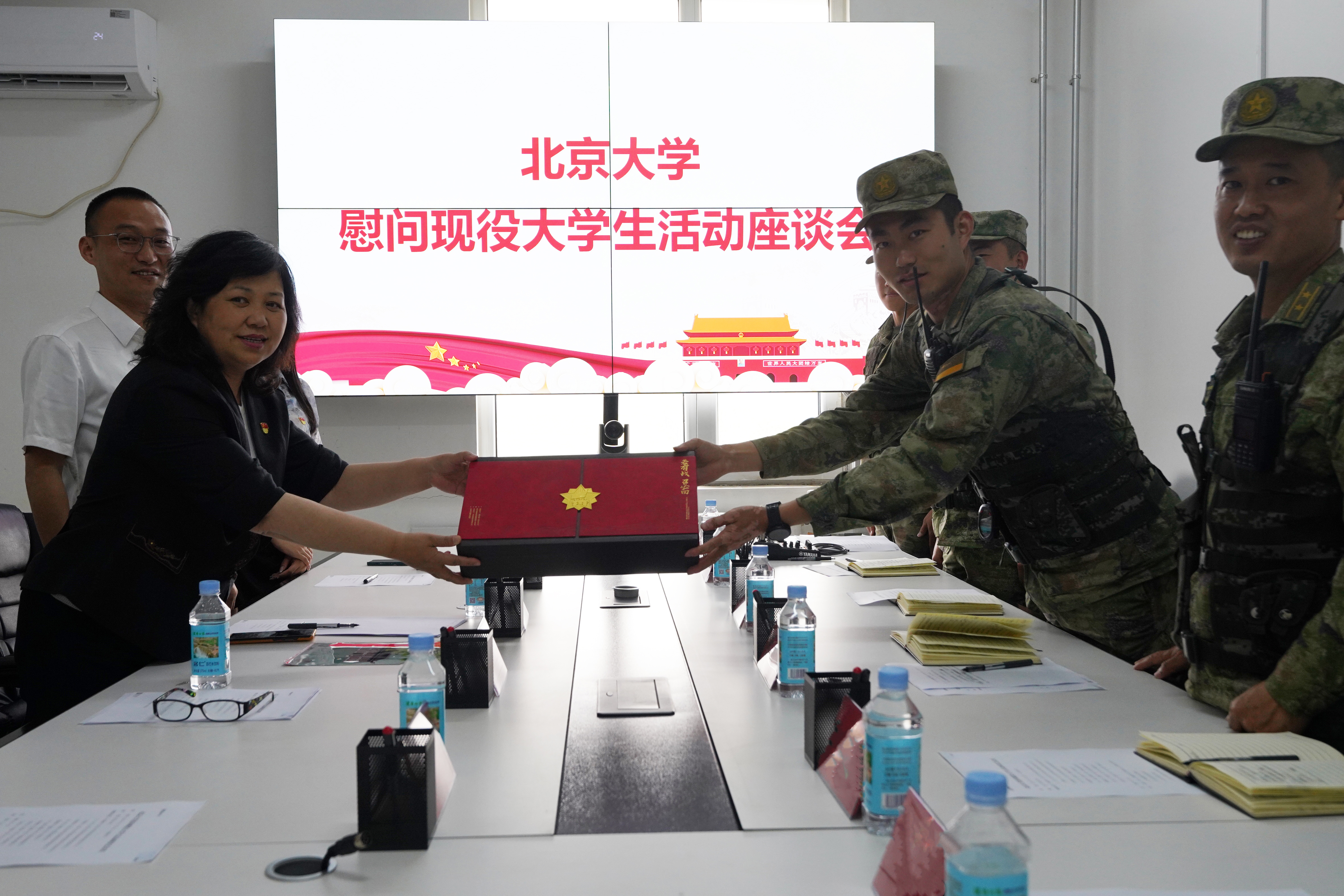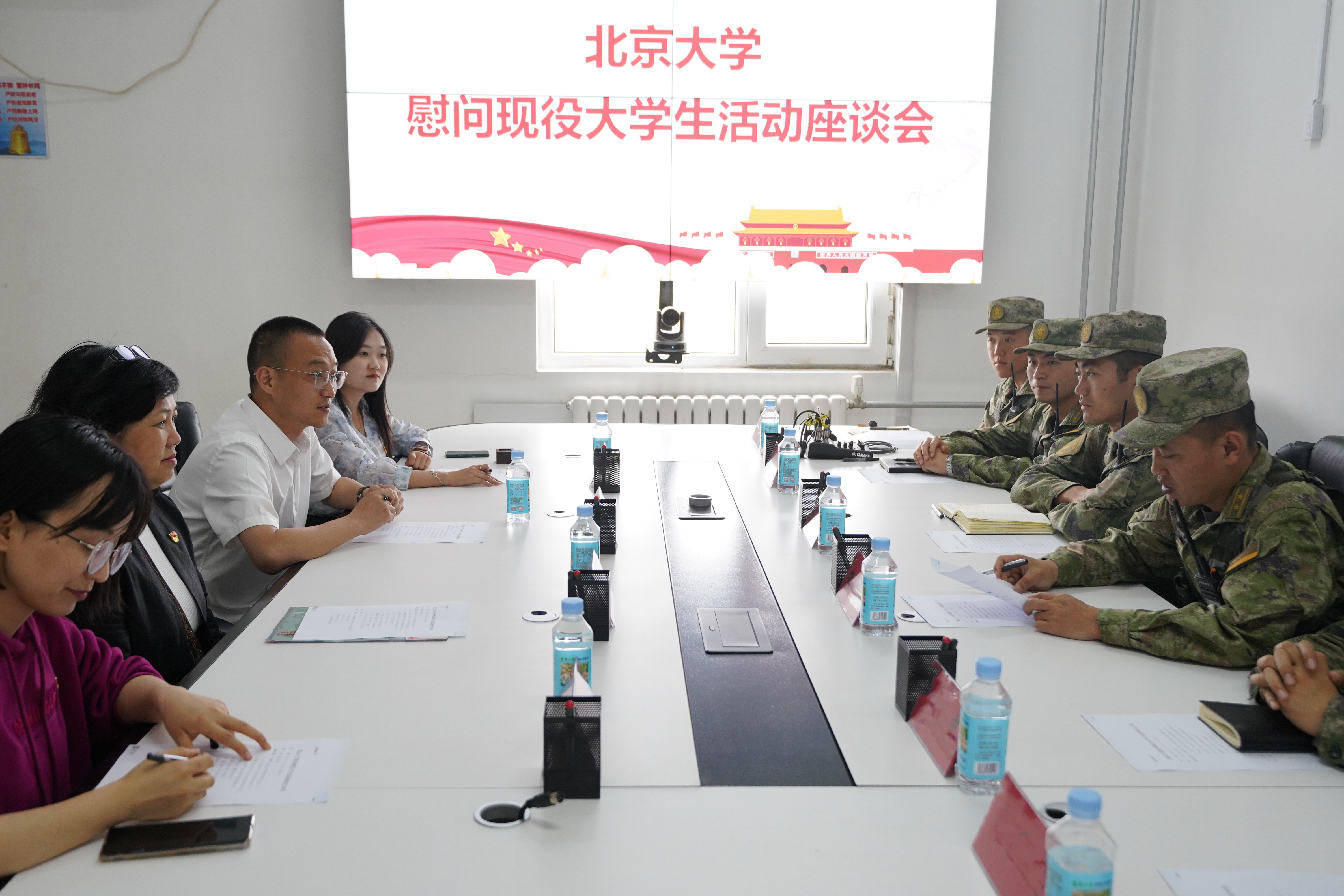 参观结束后,学院老师与部队领导在驻地会议室召开了座谈会。部队领导首先对开云官方在线入口老师的到来表示欢迎,对学校和学院大力支持国防事业、关心支持大学生参军入伍、为军队源源不断输送高素质人才的做法表示肯定与感谢。同时,部队领导还向老师们详细介绍了孙圣杰入伍以来在部队的各方面表现,强调孙圣杰在思想政治、业务技能、个人作风等方面均表现优异,展现出了北大学子的风采与担当,为战士们树立了良好的榜样。