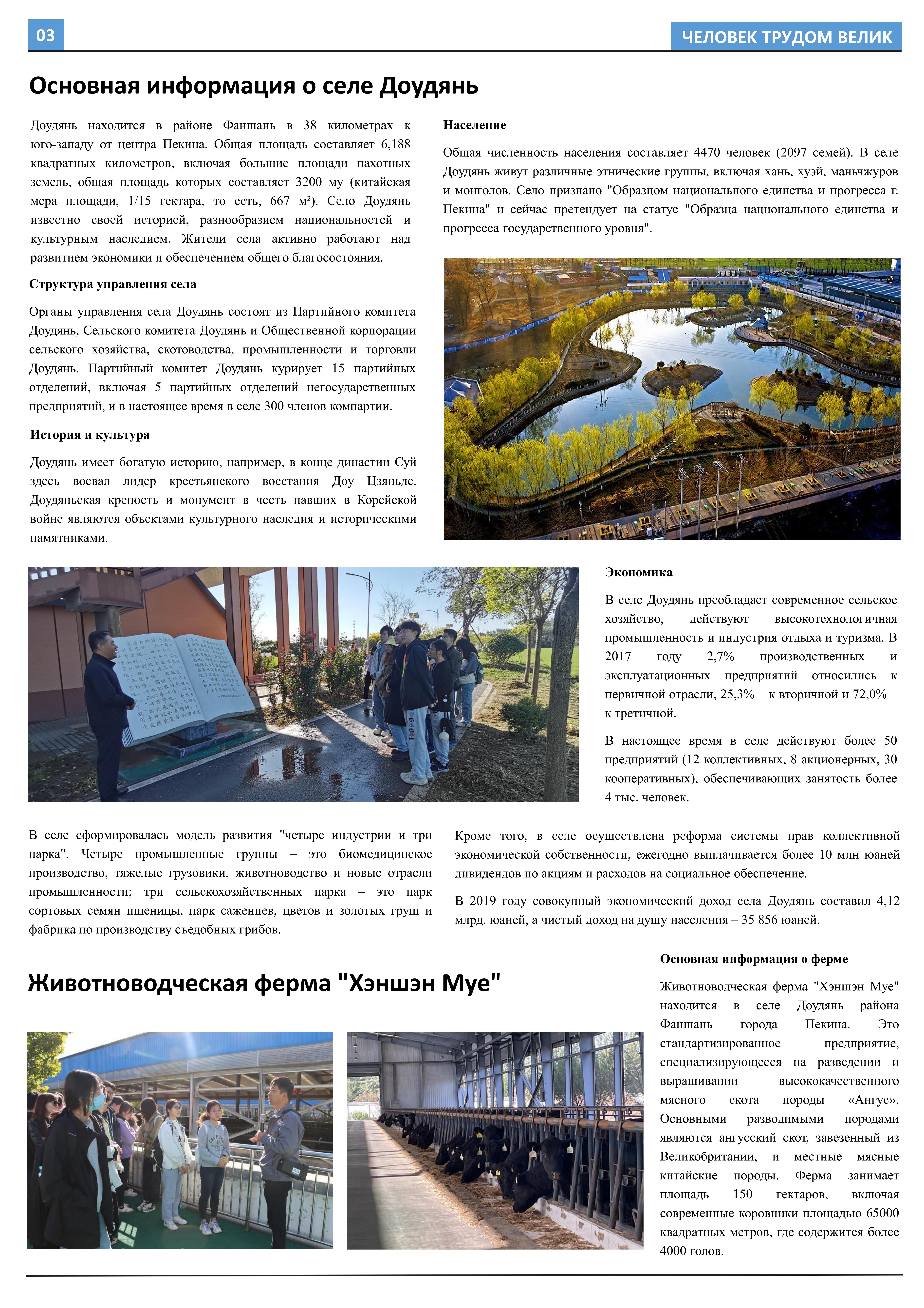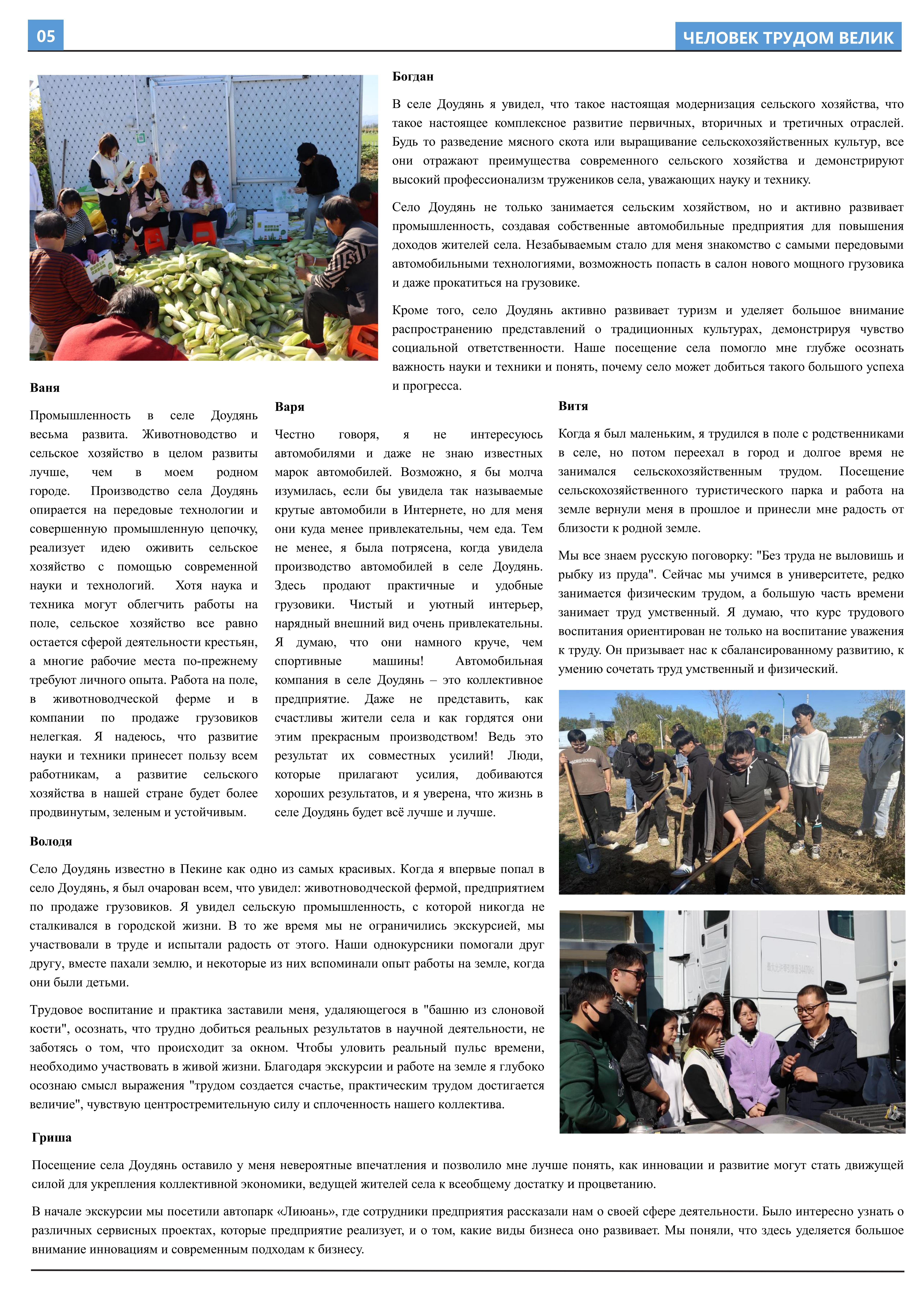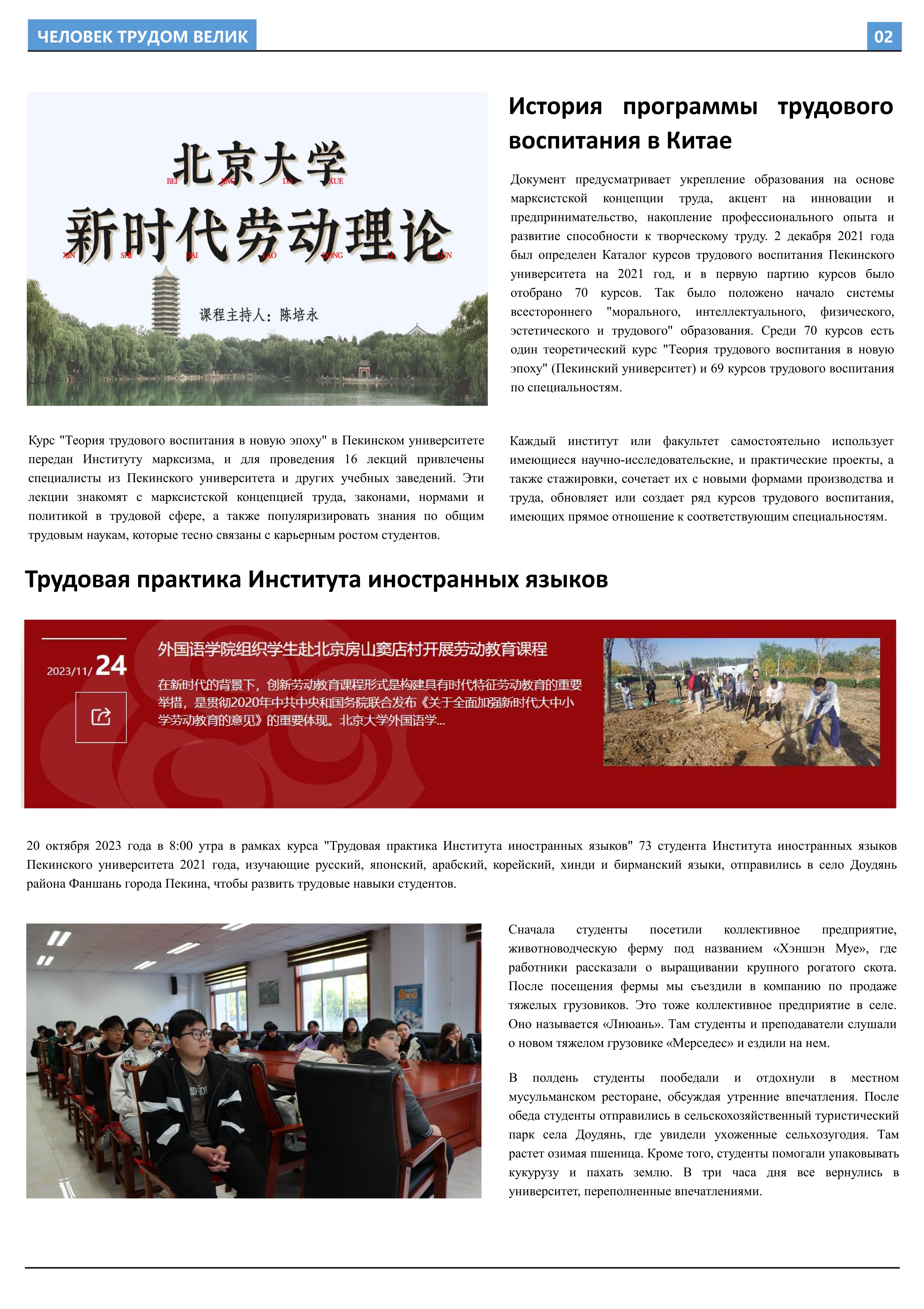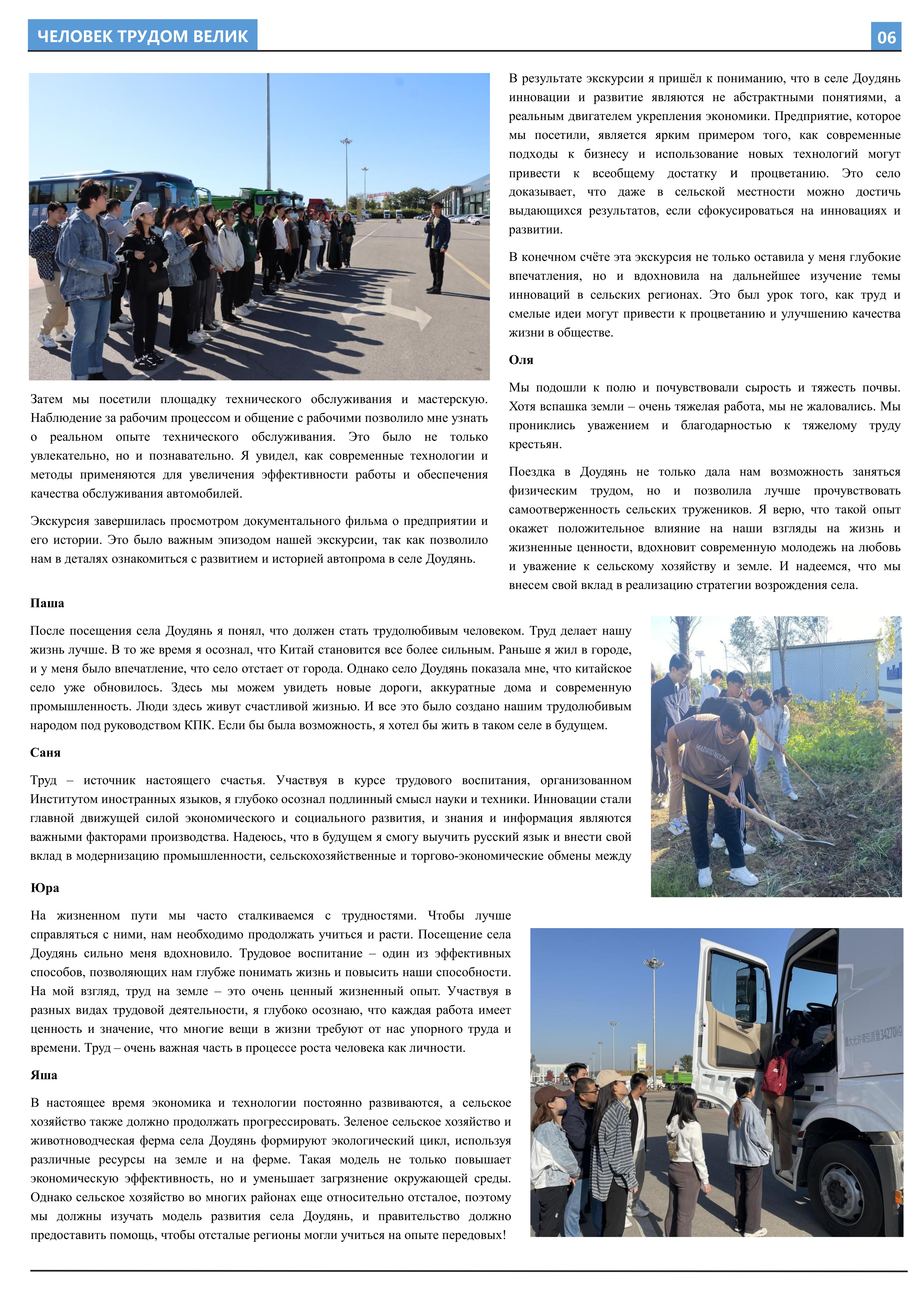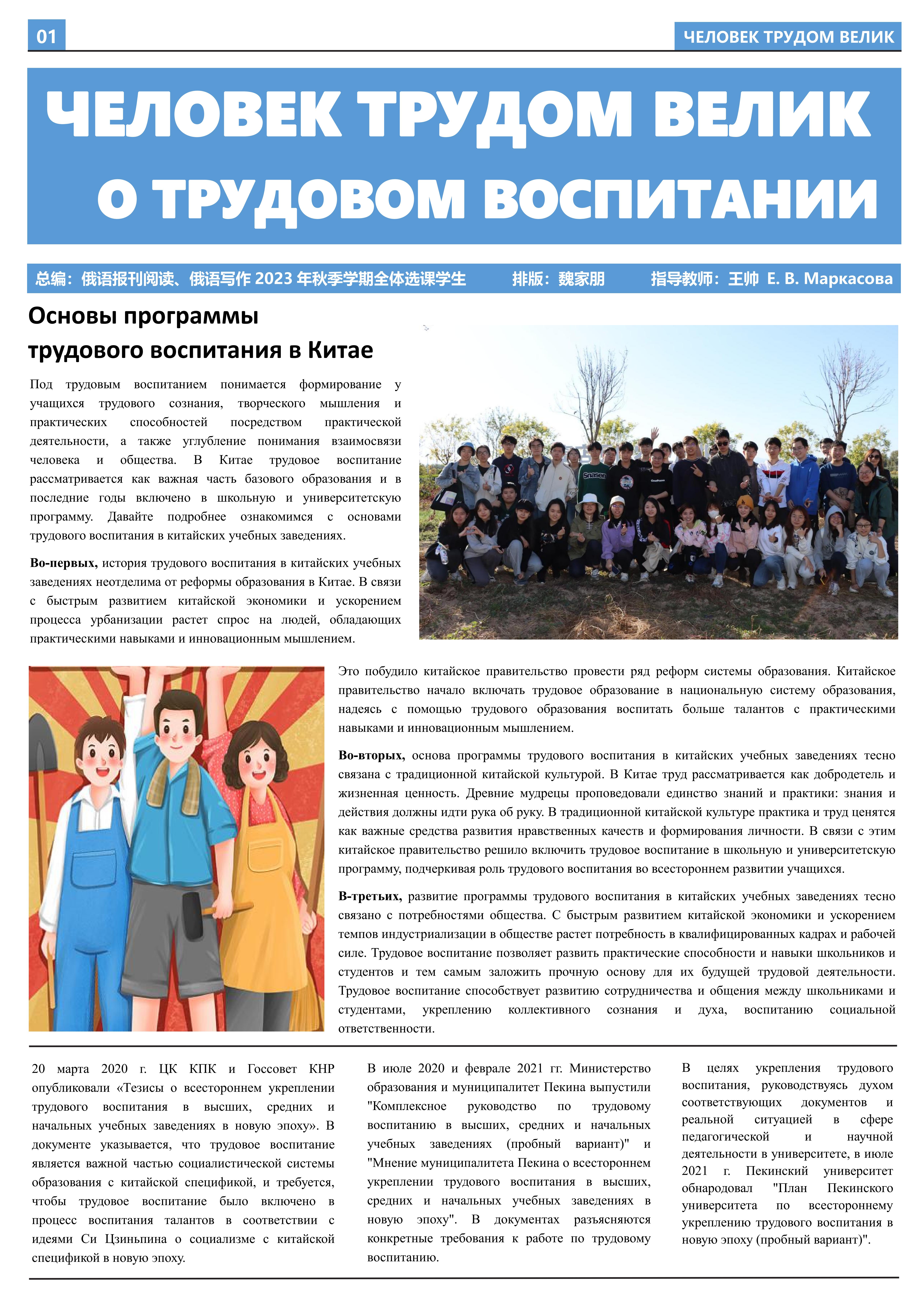在接受劳动教育、参与劳动实践后,2023年10月至2023年12月,外国语学院2021级俄语开云官方在线入口班的11名同学立足于学院平台和专业课堂(《俄语报刊阅读(上)》与《俄语写作(上)》),在两位课程主讲教师王帅和外教叶莲娜·马尔卡索娃(Елена Маркасова)的指导下,通过线上分工、小组讨论等形式商讨报纸细节,并学习使用重要概念和关键词句的俄语表达,历时近三个月,共同完成6个版面、3000余个单词数的“劳动成就人——关于劳动教育”主题报纸。报纸共分为8个大主题、13个小主题,全面介绍了外国语学院劳动教育课程的实施背景及学生参与情况,系统阐述了窦店村的历史文化与经济发展等多方面内容,并详细记录了同学们在窦店村恒升牧业畜牧养殖中心、窦店利元车业、农业观光园等劳动教学点的劳动实践与参访感受。
