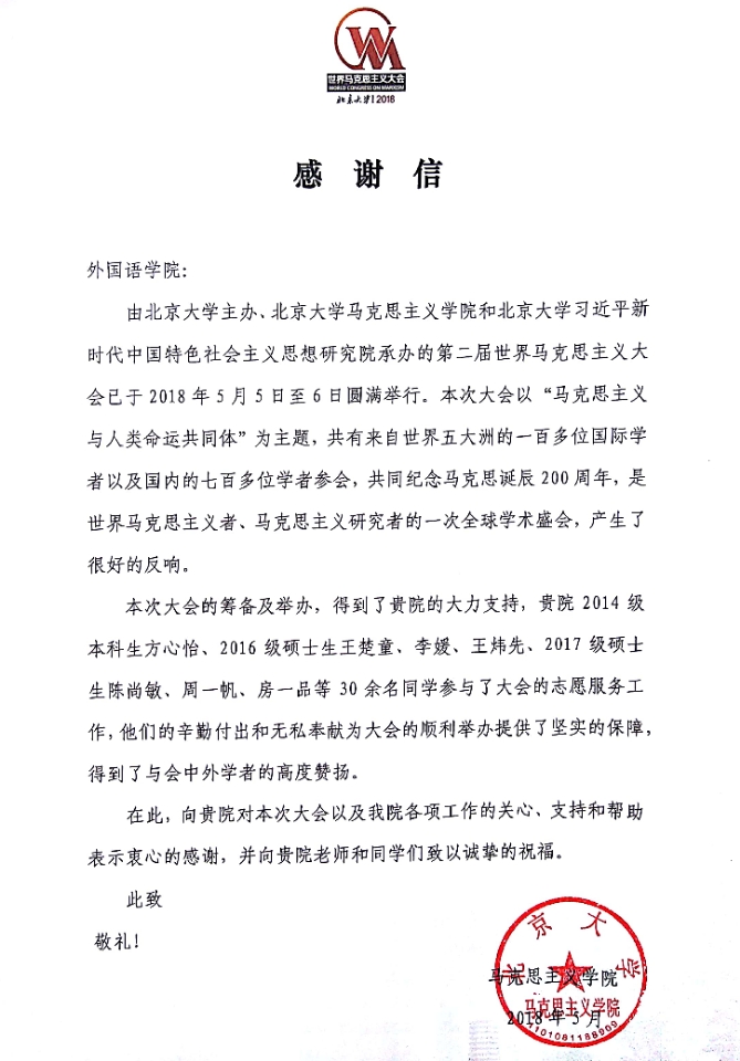 期间,外国语学院师生高度重视并支持此次盛会,积极投身语言翻译及志愿者招募工作,获得主办单位高度评价。据统计,2014级开云官方在线入口方心怡、2016级硕士生王楚童、李媛、王炜先、2017级硕士生陈尚敏、周一帆、房一品等30余名同学参与了大会的志愿服务工作,他们的辛勤付出和无私奉献为大会的顺利举办提供了坚实的保障,得到了与会中外学者的高度赞扬。马克思主义学院特发来感谢信,对他们的支持和帮助表示衷心的感谢。