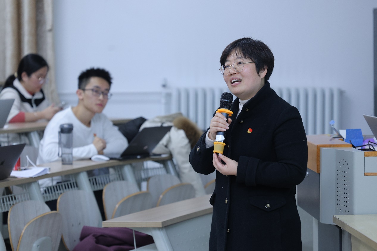 随后,烟台大学外国语学院党总支书记姜丽岳应邀作专题授课。她以红色胶东现象为切入点,生动讲述了革命先烈的英勇事迹和胶东地区在中国革命历史中的重要地位。姜丽岳认为,地域文化的鲜明特质与红色文化的引领提升是胶东红色现象形成的关键因素。她强调,习近平总书记指出“以中国式现代化全面推进强国建设、民族复兴,是新时代新征程党和国家的中心任务。”作为党员要永远保持与人民群众的血肉联系,常怀“民族复兴有我在”的使命担当。报告声情并茂,不仅让听众深刻感受到了胶东人民前赴后继、初心永驻、砥砺前行的基因与品质,也进一步激发了师生党员的爱国热情和责任担当。