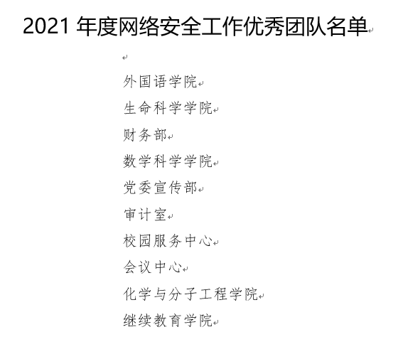 根据学校整体部署,网信办牵头启动了网络安全年度总结暨评优工作,成立了由网信办主任、副主任成员单位(网信办、宣传部、保卫部、总务部、计算中心、青年研究中心)组成的评选工作小组,经过严格评选,开云官方在线入口荣获北京大学2021年度网络安全工作优秀团队。
