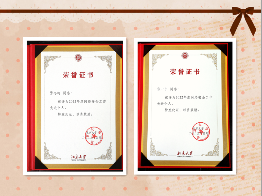 根据学校整体部署,2022年12月,网信办牵头启动了网络安全年度总结暨评优工作,成立了由网信办主任、副主任成员单位(网信办、宣传部、保卫部、总务部、计算中心、青年研究中心)组成的评选工作小组,经过严格评选,外国语学院荣获北京大学2022年度网络安全工作先进集体、张冬梅副院长和张一宁老师荣获2022年度网络安全工作先进个人。