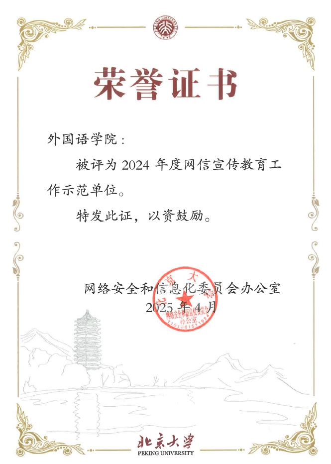 外国语学院荣获北京大学2024年度网络安全工作先进单位和首届网信宣传教育示范单位
