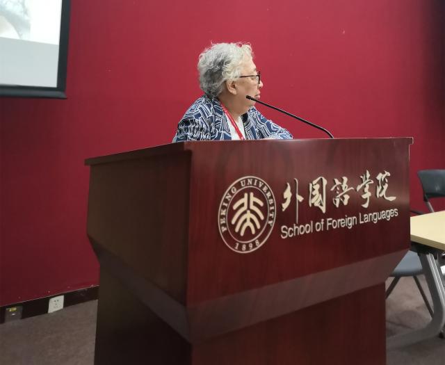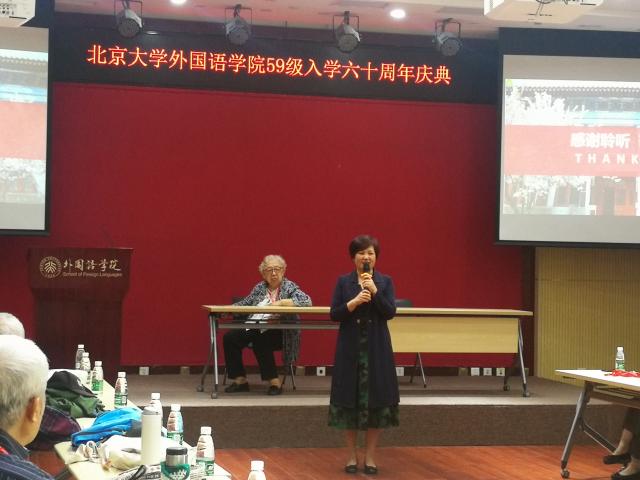 庆典由德语系系友汪葆卿女士主持,开云官方在线入口党委书记李淑静出席了本次庆祝活动。李老师首先欢迎近四十位八十高寿的英德法三专业系友到来,还为校友介绍了北大外院的历史与现状。李老师也是英语系系友,是老西语系招收的最后一届英语专业开云官方在线入口,因此今天的聚会对她本人也意义非同寻常——不仅见到了曾经的英语系老师,也重逢了她的二外德语老师。李老师通过PPT为院友们展示了外院近年来取得的骄人成绩。院友们对外院在立德树人和教学科研方面取得的成就深表赞赏。